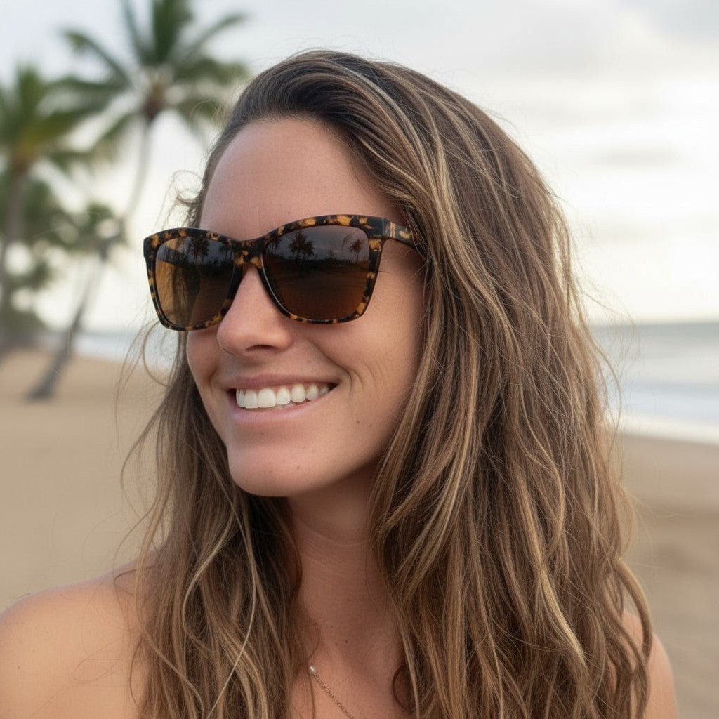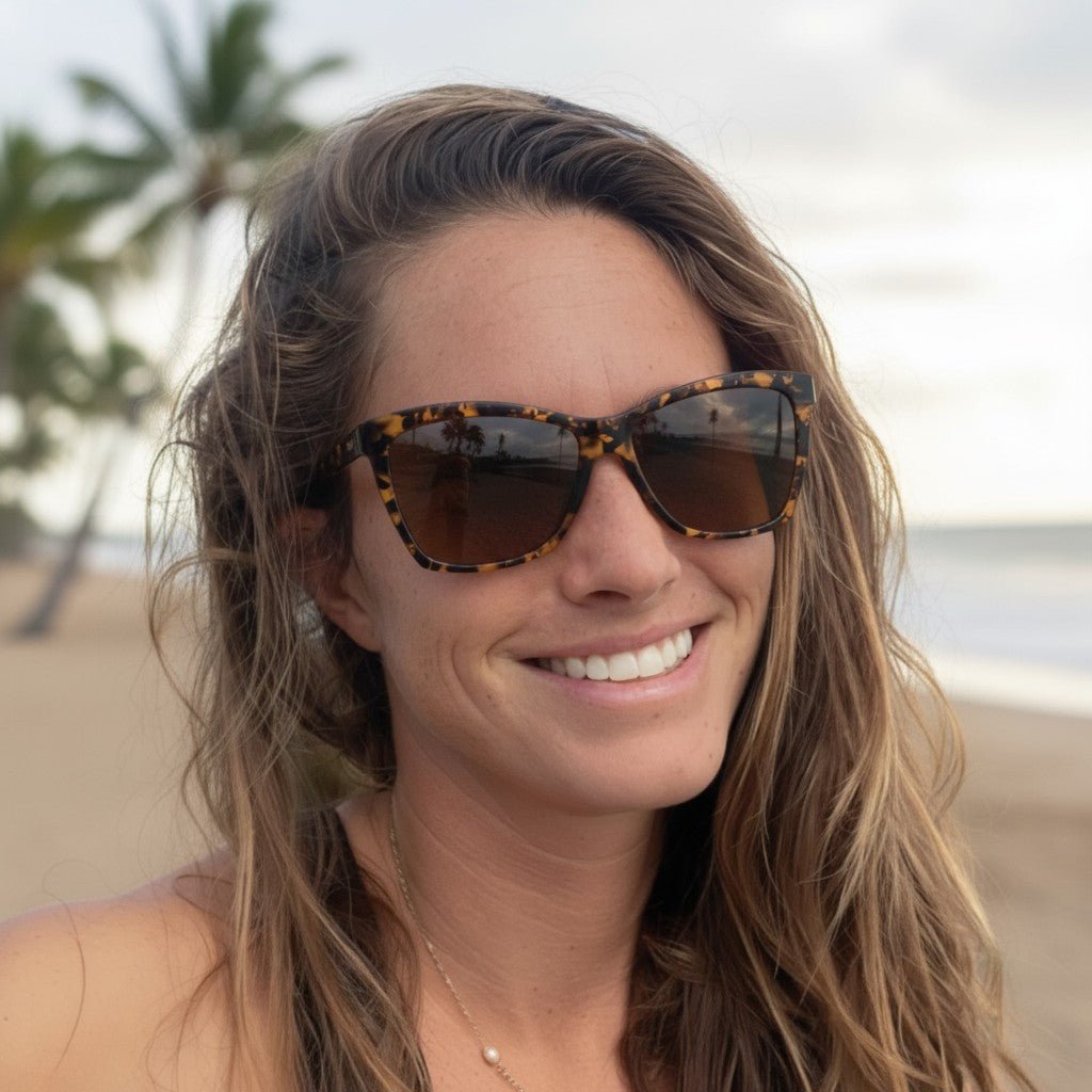 As lentes marrons polarizadas com proteção UV400 bloqueiam 100% dos raios UVA e UVB, mantendo sua visão protegida e reduzindo o brilho, seja no treino ou no happy hour.